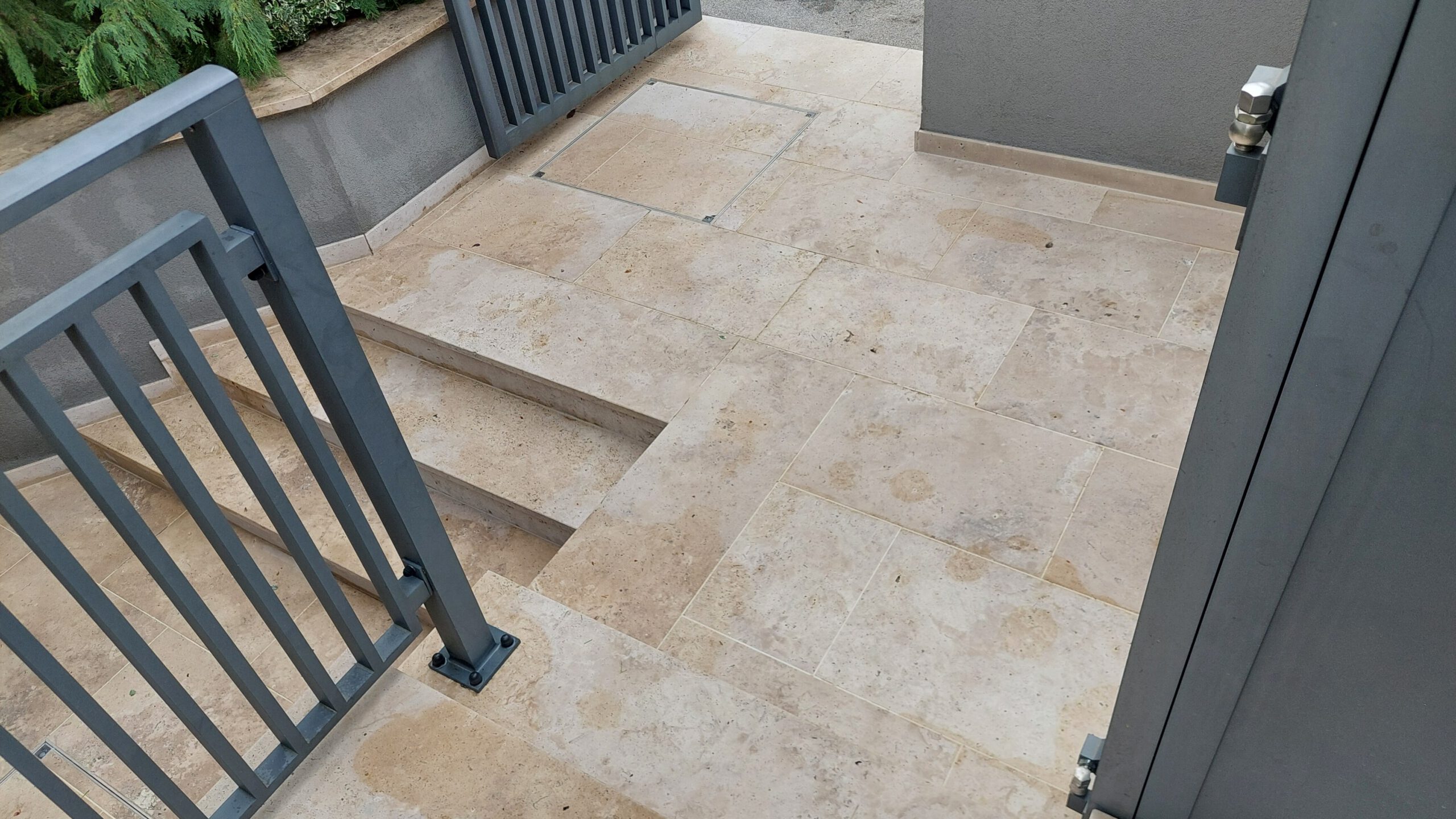 Travertin und Sandstein: Diese weicheren Gesteine sind ebenfalls beliebt. Sie haben eine warme, poröse Oberfläche und sind weniger widerstandsfähig als Granit. Sie müssen regelmäßig imprägniert werden, um sie vor Flecken zu schützen.